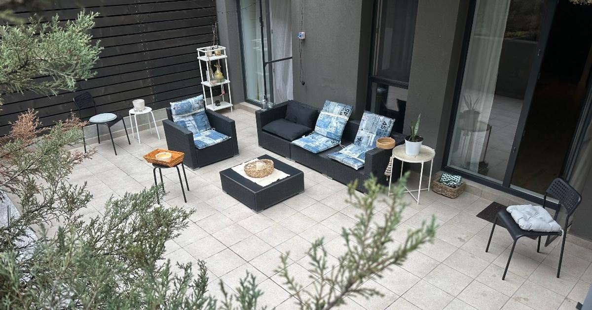 Apartamentul este situat la parter și dispune de o terasă de 20 de metri pătrați, foarte frumoasă, înconjurată de brăduți ornamentali. Terasa dă într-o zonă de curte interioară, cu o peluză verde și liniștită, ferită de trafic și de zgomotul mașinilor. Proprietatea dispune de o centrală de apartament. Bucătăria este echipată cu tot ce e nevoie, dar nu are mașină de spălat vase.