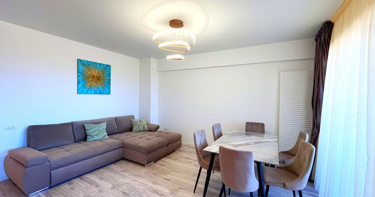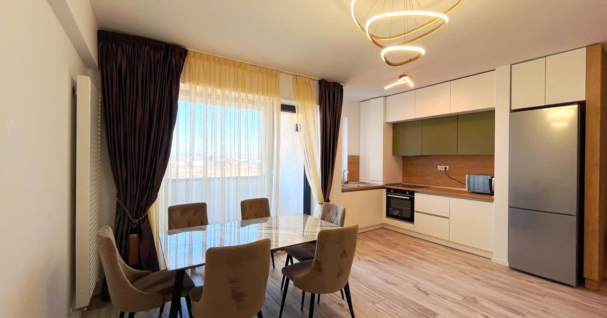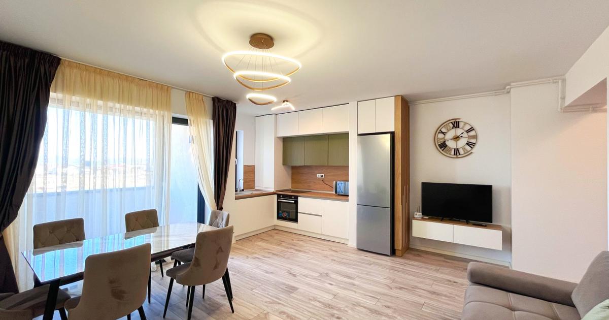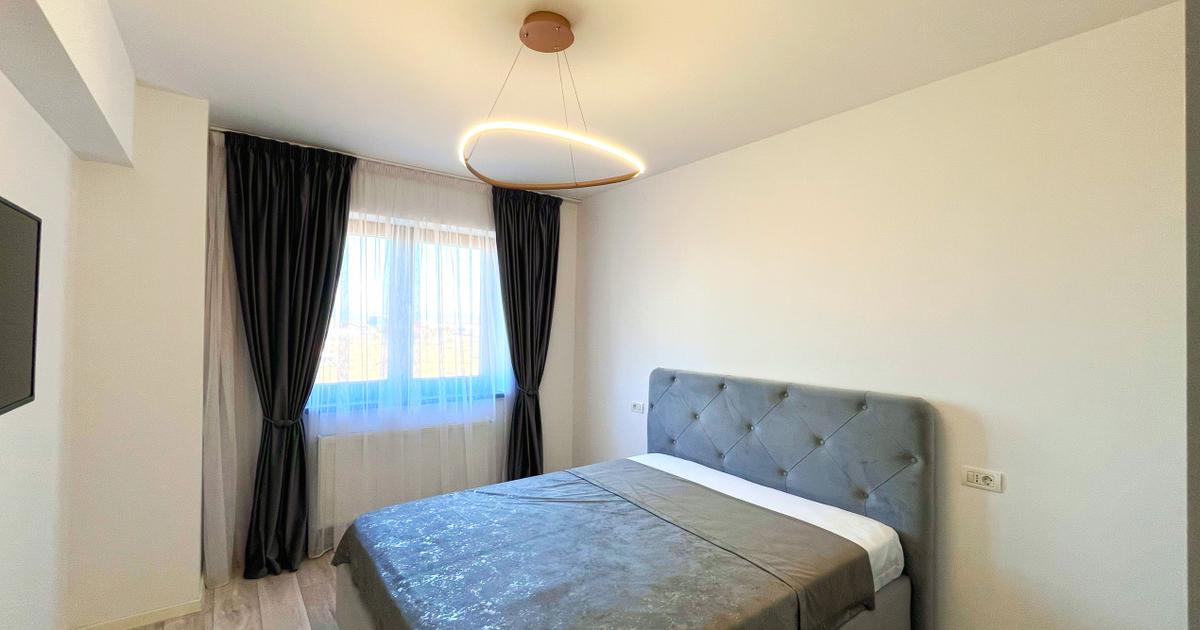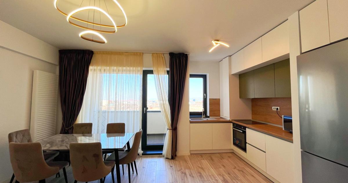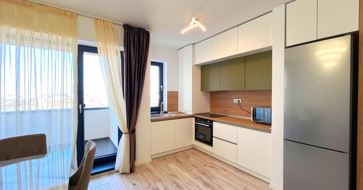 Va propunem spre inchiriere un apartament modern cu 2 camere, tip studio, open-space, situat intr-o zona linistita si apreciata din cartierul Noua, pe strada Nucului, in cadrul complexului rezidential Transilvania Residence. Proprietatea se remarca prin spatiul generos, finisajele moderne si privelistea panoramica deosebita, oferind un ambient ideal pentru un stil de viata confortabil si relaxant. Cu o suprafata utila de 62 mp, apartamentul este amplasat la etajul 5 din 10 intr-un bloc nou construit, beneficiind de lumina naturala din plin si de o compartimentare eficienta, gandita pentru confortul locatarilor. Compartimentarea este practica si functionala, fiind compusa din: • hol de acces primitor; • living spatios si luminos, integrat armonios cu bucataria open-space; • dormitor confortabil, ideal pentru odihna si relaxare; • doua bai moderne, complet echipate; • balcon generos tip logie, perfect pentru momente de relaxare si pentru a va bucura de privelistea panoram...
