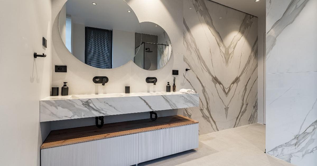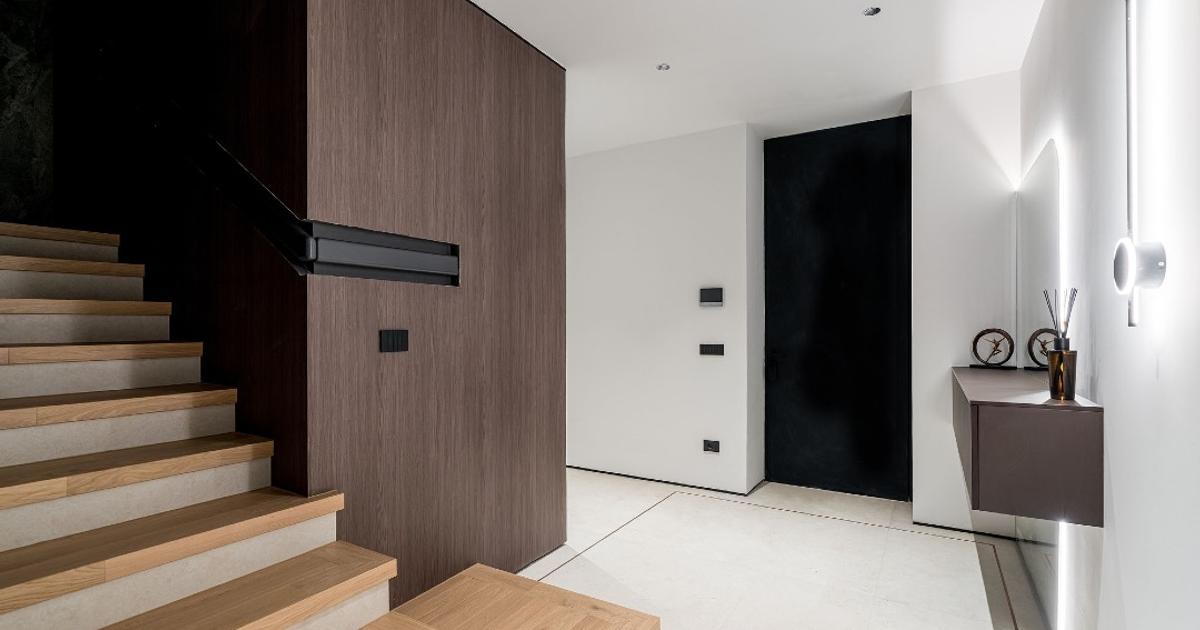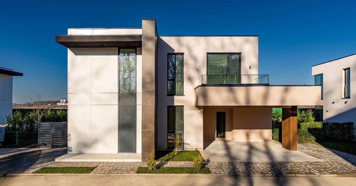 Premium finishes: Filomuro doors, Italian stone slabs, Villeroy & Boch sanitary ware, ventilated ceramic facades, Reynaers aluminum systems, and shadow gap skirting profiles