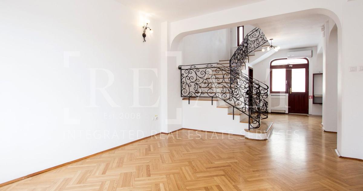 Daca sunteti in cautarea unui spatiu ideal pentru compania dvs, atunci aceasta proprietate, casa, vila cu 8 camere in suprafata de 280mp utili pe care o prezentam spre inchiriere in zona Floreasca este cu siguranta alegerea potrivita. Imobilul tip casa, vila compus din Demisol + Parter (inalt) + 1 Etaj + Mansarda a fost construit in anul 2000 pe o suprafata de teren de 200mp (10ml deschidere la strada). Compartimentarea este una potrivit pentru orice tip de destinatie intrucat proprietatea beneficiaza atat de spatii deschise, cat si de compartimentari individuale. Cele 2 modalitati de acces in imobil sunt din nou plusuri de necontestat de fiecare data cand vorbim despre autorizarea unui spatiu de lucru, birou. Din punct de vedere functional, zona demisolului este alocata garajului (2 masini mici sau una mare) si spatiilor tehnice (camera tehnica) sau depozitare / spatiu de sport; aceasta zona beneficiaza si de un grup sanitar). Parterul inalt prezinta un spatiu deschis, un biro...