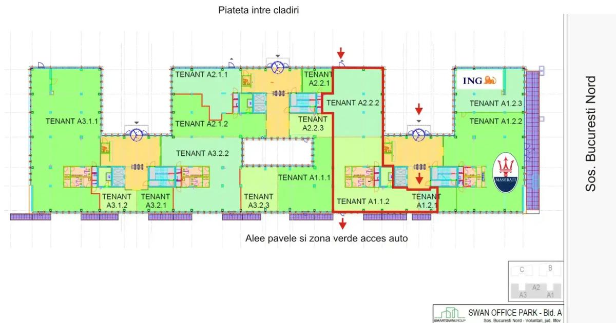 Spatiile comerciale propuse spre inchiriere se afla in partea de nord a Bucurestiului, sector 1, in vecinatatea intersecției cu Soseaua Pipera, la parterul cladirii de birouri Swan Office & Technology Park. Spatiile au suprafatele de 870 m2, 484 m2 si beneficiaza de dubla intrare (din exterior si din receptie). Vecinațile proprietatii includ cladiri de birouri, show-room-uri, parcul de retail Pipera Plaza etc. Accesibilitatea auto in zona s-a imbunatatit semnificativ în 2012, ca urmare a largirii Soselei Pipera-Tunari și a finalizarii pasajului peste Bulevardul Barbu Vacarescu. Transportul public include linii speciale de microbuz de la/catre stația de metrou Pipera. Swan Office & Technology Park include in prezent 3 cladiri, având 2 niveluri subterane, parter și 5 etaje, cu o suprafață închiriabilă totală de 29.125 m2. Parcarea are o capacitate de 530 locuri, majoritatea acestora fiind amplasate in subteran. P...