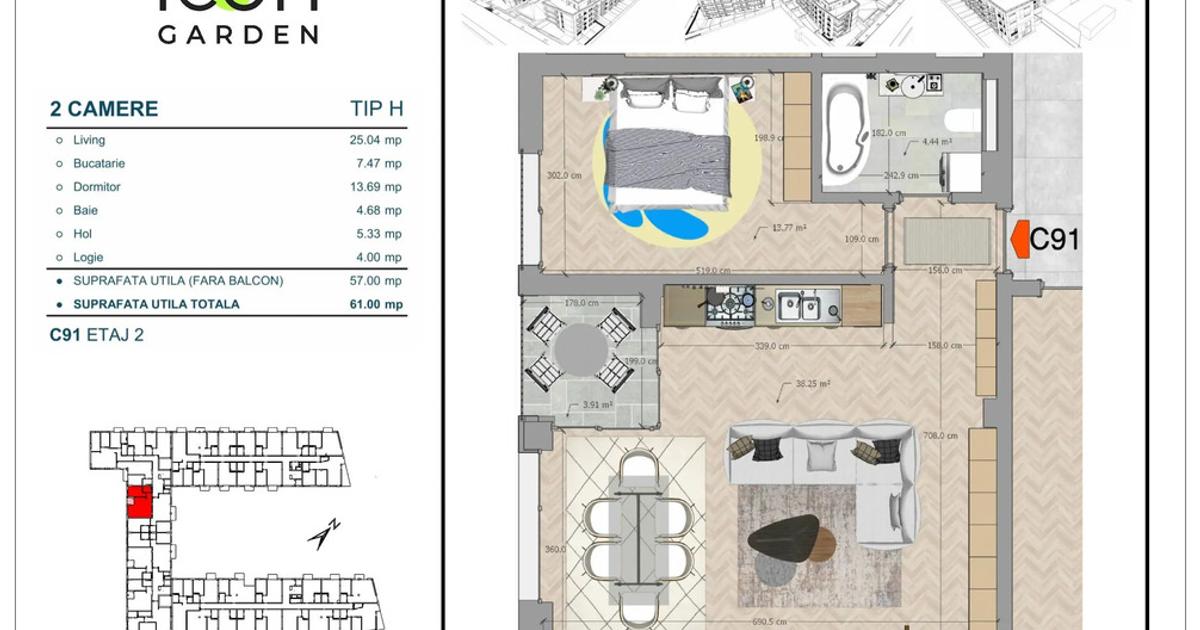 Apartament cu 2 camere de vânzare aflat la etajul 2, cu o suprafață utilă de 57 mp, construită 69,21 mp, totală 61 mp, balcon 4 mp, având o baie. Locuința este într-un imobil de 4 etaje. Face parte din proiectul ICON Garden - ansamblul rezidențial premium, unic în zona. ICON Garden este situat pe Str. Titu Maiorescu nr. 13 - 17, la doar 3 minute de mers pe jos de Mihai Bravu și 5 minute de stația de metrou Obor. Poziția este strategică, într-o zonă liniștită, de case, cu trafic auto redus și cu acces facil către centrul Bucureștiului. În apropiere se află școli și grădinițe, centre comerciale și zone de agrement, dar și de restaurante, cafenele și terase. Construit cu materiale de înaltă calitate și dotat cu facilități exclusiviste, ansamblul oferă multiple beneficii: • Regim redus de înălțime: S + P + 3 etaje + etajul 4 retras; • Grădină interioară de 1590 mp, amenajată cu alei și spații verzi generoase - un adevărat spațiu de relaxare în mijlocul orașul...