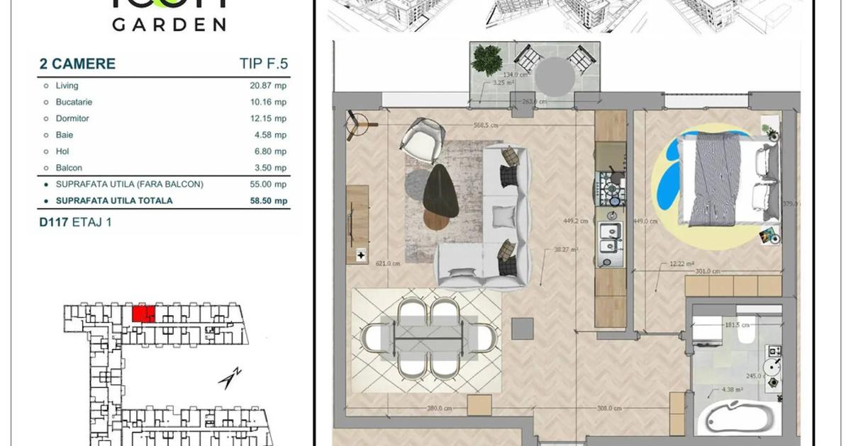 Apartament cu 2 camere de vânzare aflat la etajul 1, cu o suprafață utilă de 54,5 mp, construită 65,23 mp, totală 58 mp, balcon 3,5 mp, având o baie. Locuința este într-un imobil de 4 etaje. Face parte din proiectul ICON Garden - ansamblul rezidențial premium, unic în zona Moșilor, cu predare în 2025. ICON Garden este situat pe Str. Titu Maiorescu nr. 13 - 17, la doar 3 minute de mers pe jos de Calea Moșilor și 5 minute de stația de metrou Obor. Poziția este strategică, într-o zonă liniștită, de case, cu trafic auto redus și cu acces facil către centrul Bucureștiului. În apropiere se află școli și grădinițe, centre comerciale și zone de agrement, dar și de restaurante, cafenele și terase. Construit cu materiale de înaltă calitate și dotat cu facilități exclusiviste, ansamblul oferă multiple beneficii: • Regim redus de înălțime: S + P + 3 etaje + etajul 4 retras; • Grădină interioară de 1590 mp, amenajată cu alei și spații verzi generoase - un adevărat spațiu de relaxare...