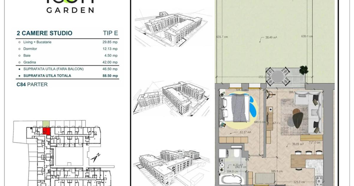 Cumperi direct de la dezvoltator. Comision 0%. Apartament cu 2 camere de vânzare aflat la parter, cu o suprafață utilă de 54 mp, construită 57,07 mp, totală 96 mp, grădină 42 mp, având o baie. Locuința este într-un imobil de 4 etaje. Face parte din proiectul ICON Garden - ansamblul rezidențial premium, unic în zona Ștefan cel Mare, cu predare în 2025. ICON Garden este situat pe Str. Titu Maiorescu nr. 13 - 17, la doar 3 minute de mers pe jos de Calea Moșilor și 5 minute de stația de metrou Obor. Poziția este strategică, într-o zonă liniștită, de case, cu trafic auto redus și cu acces facil către centrul Bucureștiului. În apropiere se află școli și grădinițe, centre comerciale și zone de agrement, dar și de restaurante, cafenele și terase. Construit cu materiale de înaltă calitate și dotat cu facilități exclusiviste, ansamblul oferă multiple beneficii: • Regim redus de înălțime: S + P + 3 etaje + etajul 4 retras; • Grădină interioară de 1590 mp, amenajată cu alei și spaț...