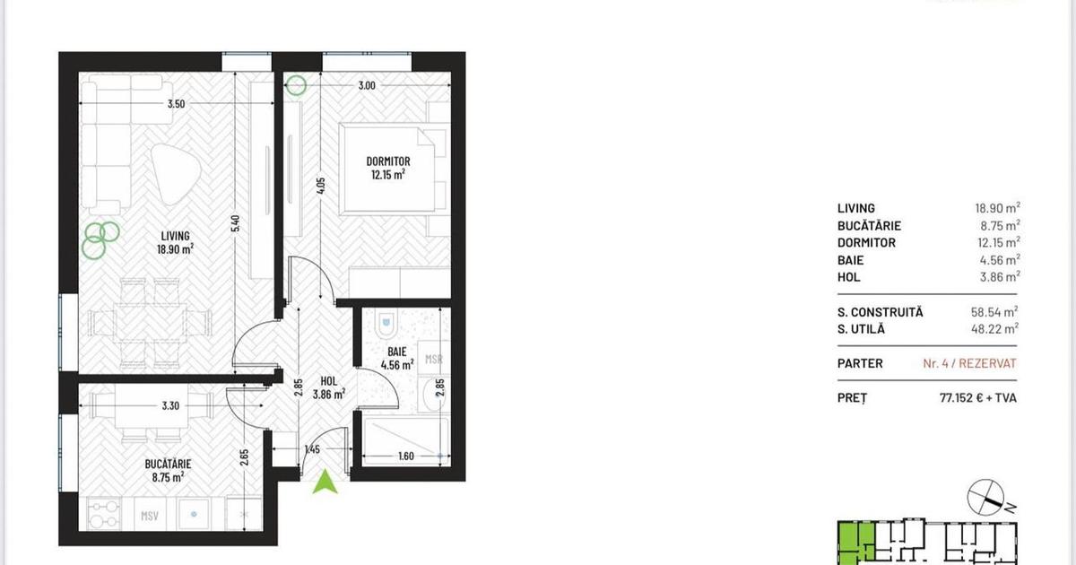 🏢 Green Park Apartments | Apartamente 2 camere | Parcare subterană inclusă | Etaje 1–3 | Finalizare septembrie 2026 📍 Bloc 1 – Proiect rezidențial nou în fază de pre-vânzare 🔨 Începere lucrări: August 2025 🏁 Finalizare estimată: Septembrie 2026 🅿️ Loc de parcare subteran inclus în preț Descoperă apartamentele cu 2 camere din cadrul Green Park Apartments, fiecare cu balcon privat, compartimentare inteligentă, finisaje moderne și poziționare ideală într-o zonă liniștită, dar bine conectată la facilități urbane. ⸻ 🏠 Tip 1 – Apartament compact, eficient și accesibil • 📐 Suprafață utilă: 48.22 mp • ➕ Balcon: 4.80 mp • 🧱 Suprafață construită: 58.54 mp • 🛋 Living: 18.90 mp • 🍽 Bucătărie: 8.75 mp • 🛏 Dormitor: 12.15 mp • 🛁 Baie: 4.56 mp • 🚪 Hol: 3.86 mp • 💶 Preț: 77.152 € + TVA • 🏢 Etaj: Parter ⸻ 🏠 Tip 2 – Dormitor spațios și zonare echilibrată • 📐 Suprafață utilă: 52.94 mp • 🧱 Suprafață construită: 68.18 mp • 🛋 Living: 18.20 mp •...