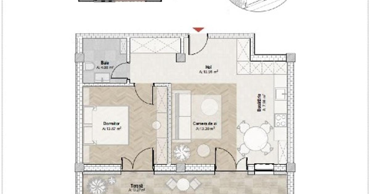 Compartimentarea semidecomandata si bucataria deschisa creeaza un ambient modern, practic si confortabil! Compartimentare :
