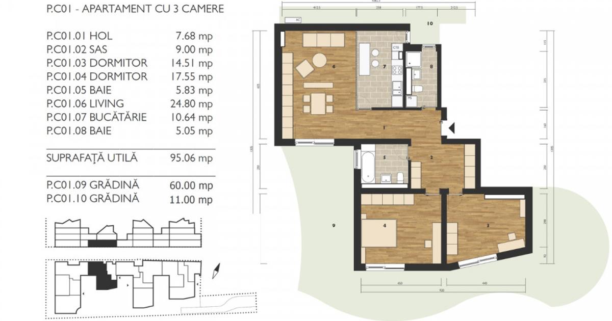Vă invităm să descoperiți apartamentul C01 situat la parterul ansamblului rezidențial M99 din Brașov. Acest apartament cu 3 camere, are o suprafață de 97 m², oferă un spațiu generos și bine structurat, ideal pentru cei care caută confort și stil într-o locație centrală. Apartamentul orientat către E-S-V, include două dormitoare și două băi moderne. De jur împrejurul apartamentului are grădină proprie de 71,4 m², unde vă puteți relaxa și bucura de liniște. Ansamblul M99, compus din 4 clădiri, promovează calitatea și sustenabilitatea, integrându-se armonios în peisajul istoric al orașului, oferind astfel un stil de viață modern și rafinat.