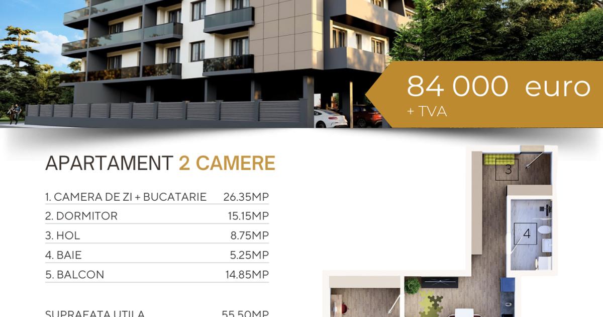 Apartament cu 2 camere, disponibil în aceeași configurație la etajele 2 și 3 ale blocului Sisi Residence, oferă un living spațios cu bucătărie open-space, 1 dormitor, 1 baie și o terasă generoasă de 14.85 mp. Pret: 84 000 euro + TVA Termen de finalizare 31.05.2026 SISI Residence este situat pe strada Odessa nr. 6, în cartierul Tomis Nord, Constanța, în spatele magazinului Dedeman.