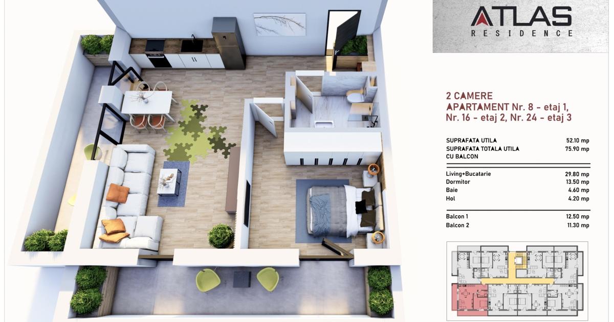 Apartament 2 camere in suprafata utila totala de 76mpu și 90 mpc. Apartamentele se predau la stadiul de glet, iar la dorința clientului se pot finisa contra cost! Preturile sunt in euro și nu includ TVA! Un nou proiect rezidential marca ATLAS Imobiliare va oferă spre vânzare apartamente premium de 2,3 și 4 camere! Blocul este construit din fonduri private nefiind nevoie de finantarea bancii. Blocul beneficiaza de lift de ultima generatie! Compartimentarea functionala si eficienta a apartamentelor completeaza perfect nevoia dumneavostra de spatiu si confort! Pentru o mai bună imagine asupra ansamblului și pentru o discuție mai amplă, vă invităm pe această cale la locație, pentru a a găsi locuința care vi se potrivește cel mai bine. Oferta de preț pentru apartamentele disponibile în cadrul proiectului. Prețul variază în funcție de etaje, poziționare și mod...
