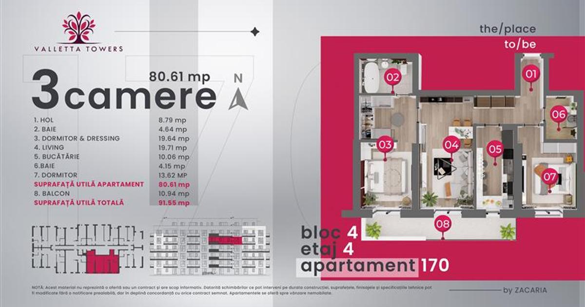 Direct dezvoltator 0% Comision La pretul afisat se adauga tva conform legii in vigoare. Complexul Valletta Towers se desfășoară pe o suprafață de 8707mp și este format din 4 blocuri cu un număr total de 190 de apartamente, beneficiind de 57 de parcări supraterane si 140 de parcări subterane pe cele doua niveluri. Cele 190 de apartamente vor fi finisate integral la cheie, cu dotări de lux, iar întreg ansamblul situat în cea mai dezirabilă zonă din Craiova va fi construit cu atenție la fiecare mic detaliu. Valletta Towers reprezintă un nou de stil de viață, oferind un echilibru perfect între confortul de acasă, facilități moderne și accesibilitatea zonei centrale. Complexul va fi unul privat, având acces restricționat (bariera, paza si monitorizare video).