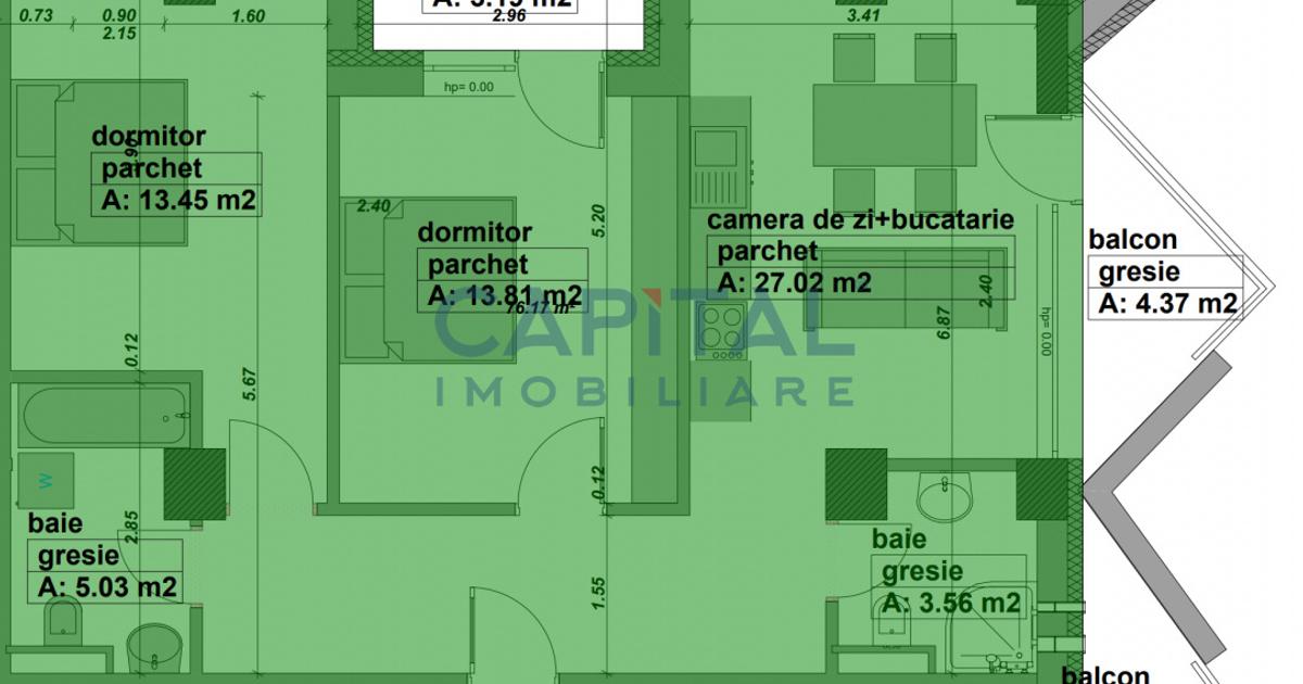 Capital Imobiliare va propune spre vanzare un apartament de 3 camere, situat la etajul 2 intr-un complex rezidential nou si modern in cartierul Vasile Alecsandri din Baia Mare. Suprafata construita: 83.73 mp Suprafata utila totala: 70.43 mp Balcoane: 7.56 mp Compartimentare: Living cu bucatarie open-space: 27.02 mpu Dormitor: 13.81 mpu Dormitor: 13.45 mpu Baie 1: 5.03 mpu Baie 2: 3.56 mpu Logie: 3.19 mpu Balcon: 4.37 mpu Dotari si avantaje: Apartamentul se vinde cu instalatie de incalzire prin pardoseala si centrala termica in condensare Fatada ventilata si finisaje moderne in spatiile comune Complex cu 2 lifturi, 2 scari de acces, boxe de depozitare si spatii comerciale la parter Supraveghere video si standarde ridicate de siguranta Pozitionare excelenta: zona retrasa si linistita, aproape de Shopping Park Baia Mare, Lidl, Kaufland, parcul central, unitati de invatamant si alte puncte de interes Parcare: Locuri de parcare exterioara: 4,500 EUR+TVA Locuri...