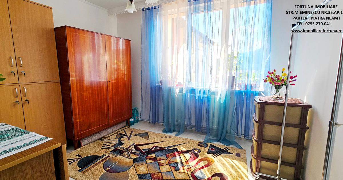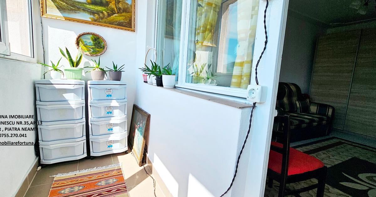 FORTUNA IMOBILIARE oferă spre achiziționare acest apartament cu un view spectaculos, ce asigură o imagine panoramică a orașului Piatra Neamț, situat în proximitatea Complexului Orion - Mun. Piatra Neamț, într-o zonă liniștită, cu mult spațiu verde, fără zgomot stradal. Apartamentul cu o suprafață utilă de 61,11 mp, plus logie 3,30 mp, situat la et. 10/10, în bloc acoperit cu tablă, este pe structură semidecomandată, fiind compus din 4 camere, 2 holuri, bucătărie, baie ( cu aerisire naturală ) și balcon închis cu termopan.