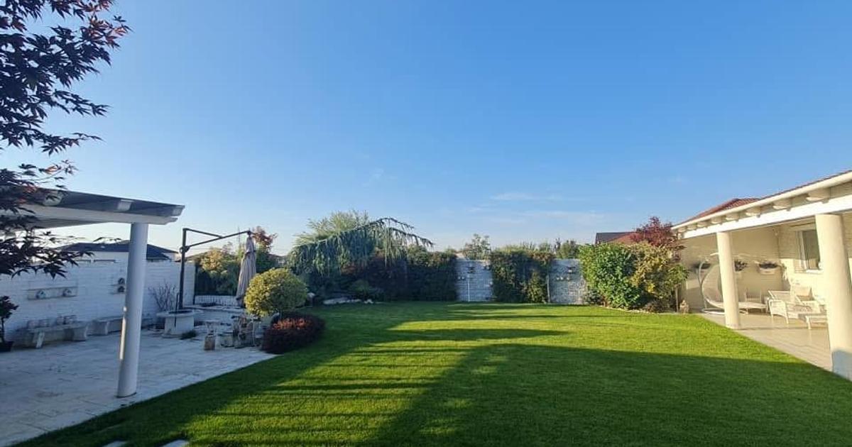 - curte amenajată cu gazon, pomi și flori