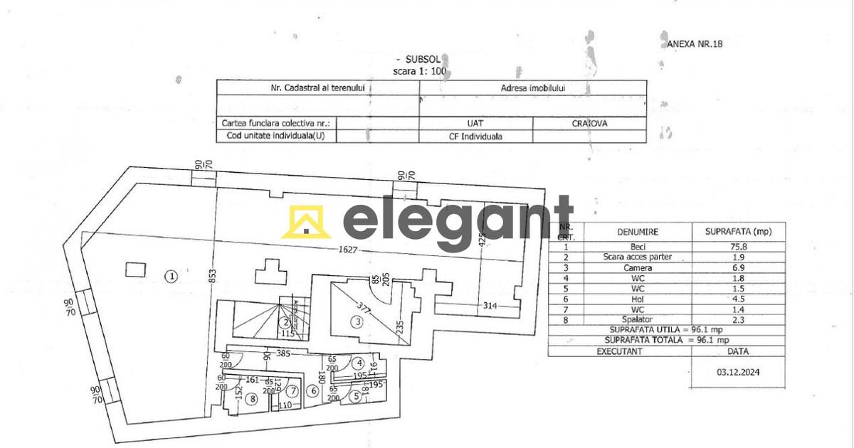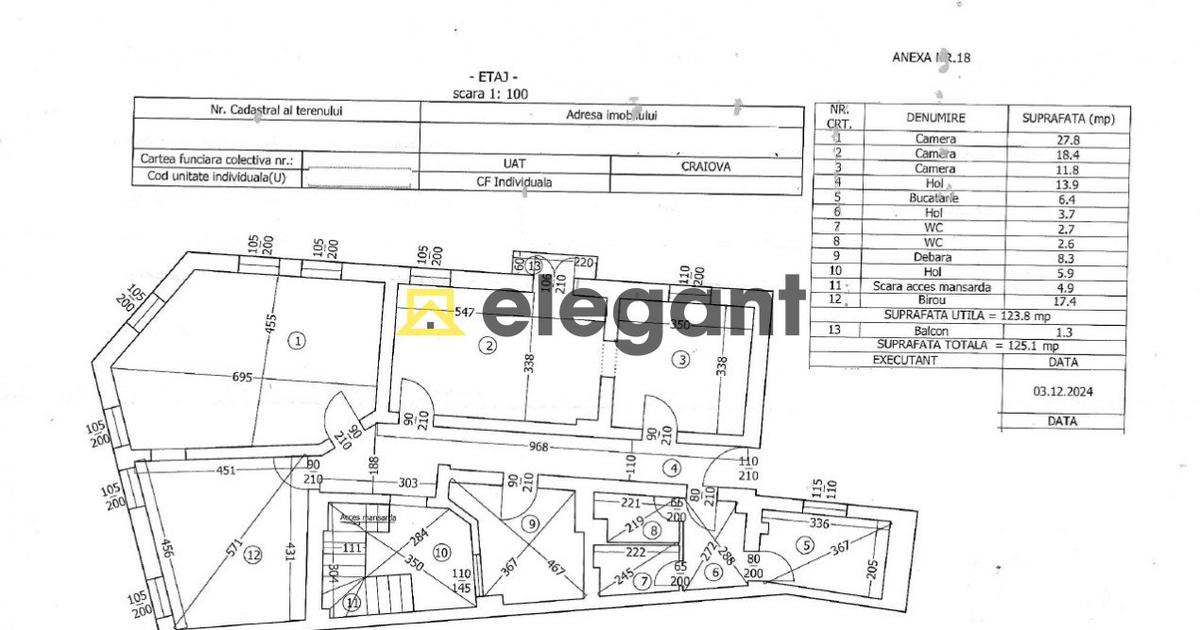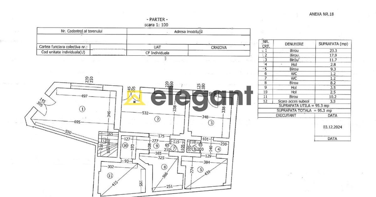 ELEGANT IMOBILIARE propune in exclusivitate spre vanzare o cladire mixta formata din spatii comerciale, spatii de birouri si garsoniere, cladire compusa din subsol, parter, etaj si mansarda. Constructia are vad foarte ridicat, fiind situata in zona Ultracentrala, in apropiere de Madona Dudu. Cladire consolidata, modernizata si recompartimentata cu autorizatie in anul 2009. Nu figureaza inregistrata ca monument istoric, este doar situata in perimetrul centrului istoric al Craiovei. Cladire cu regim de inaltime S+P+E+M cu o suprafata utila de 435.80 mp, suprafata totala de 437.10 mp, este compartimentata astfel: - 3 spatii la parter, din care unul are scara interioara cu subsolul (fiecare spatiu cu grup sanitar propriu), 96.10 mp suprafata utila subsol si 95.30 mp suprafata utila parter; - la etaj sunt 5 spatii de birouri cu 2 grupuri sanitare si o camera tehnica (camera centralelor), 123.80 mp suprafata utila plus balcon de 1.30 mp, suprafata totala 125.10 mp; - la mansarda sun...