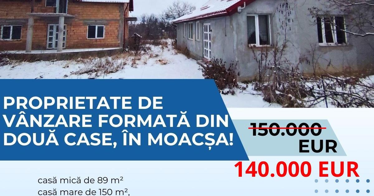 Se vinde proprietate compusă din două case în localitatea Moacșa, amplasată într-o zonă liniștită. Pe teren se află o casă mică de 89 m² și o casă mare de aproximativ 150 m², aflată la roșu. Ambele construcții sunt acoperite cu tablă tip Lindab.