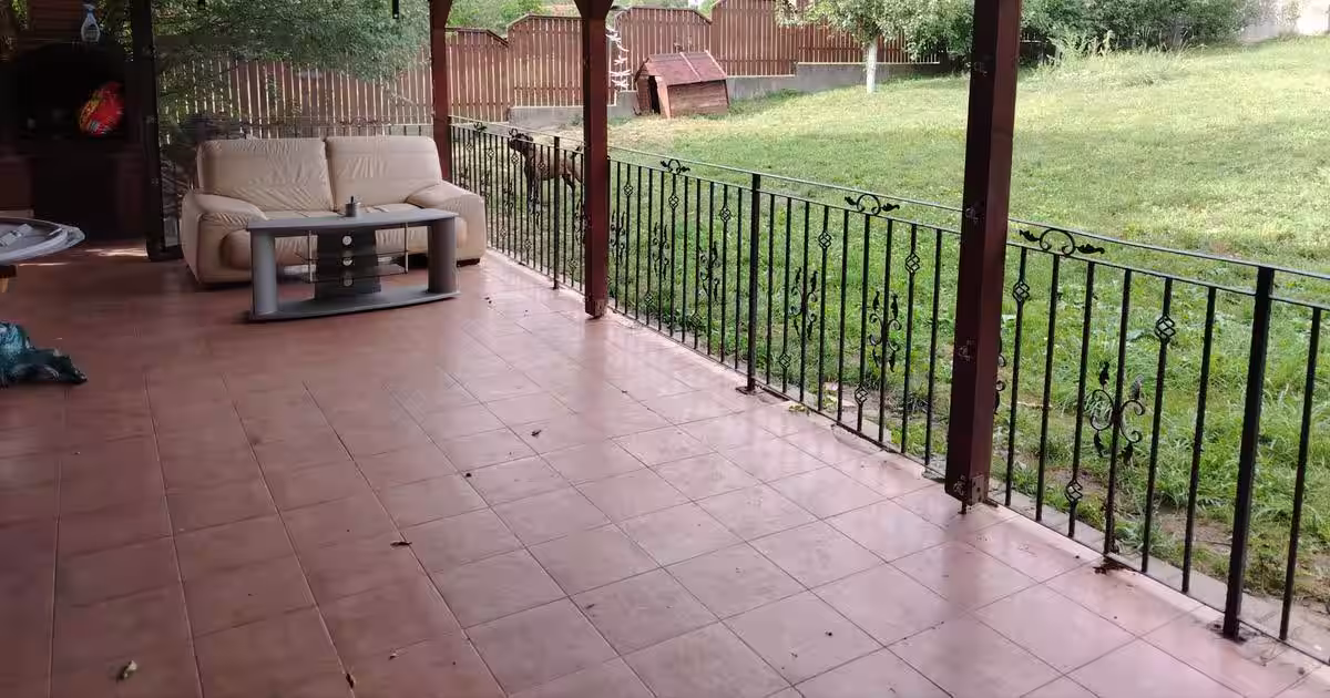 Curte este pavata atat partea din fata,cat si lateralele casei , iar partea din spatele casei dispune de un spatiu verde cu iarba si pomi fructiferi, continuarea terasei....