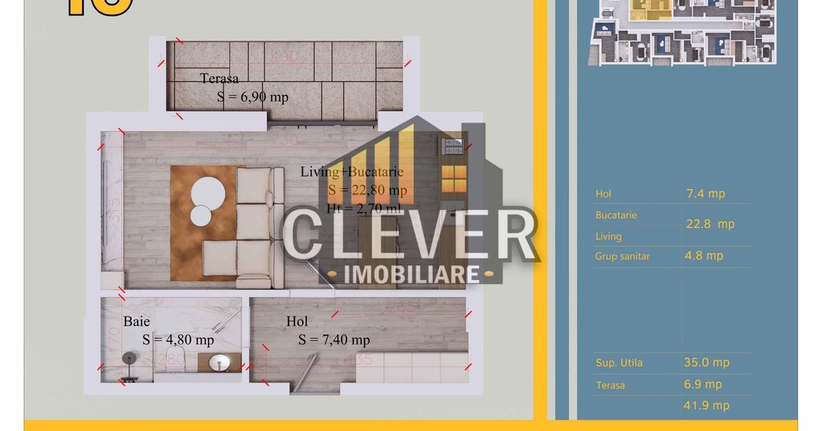 Garsonieră modernă situată într-un proiect rezidențial contemporan din zona Theodor Pallady – Sector 3. Imobil cu regim redus de înălțime, număr limitat de apartamente și ambient liniștit, ideal pentru locuire proprie sau investiție. Locuința are o suprafață utilă de aproximativ 35 mp, la care se adaugă terasă de 6,9 mp, rezultând o suprafață totală de 41,9 mp. Înălțime cameră: 2,70 m. Compartimentare Living + bucătărie open-space: 22,8 mp Baie: 4,8 mp Hol: 7,4 mp Terasă: 6,9 mp Spațiul este eficient organizat, cu zonă de zi generoasă pentru tipologia unei garsoniere și acces direct către terasă. Dotări și beneficii incluse Încălzire prin pardoseală Centrală termică proprie în condensare Tâmplărie PVC cu geam triplu pentru izolare termică și fonică Baie echipată complet, inclusiv vas WC încastrat Ușă metalică de siguranță Posibilitatea alegerii finisajelor interioare (gresie, faianță, parchet, uși) Imobilul este branșat la toate utilitățile publice: apă, canalizare,...