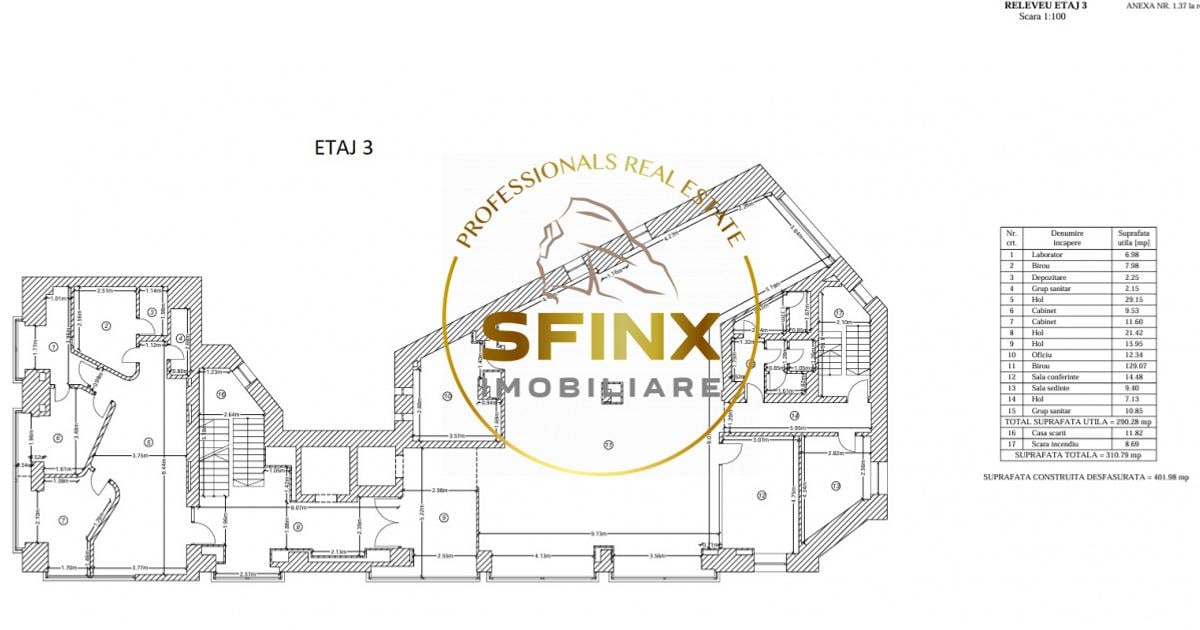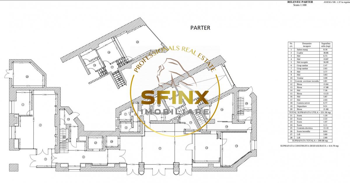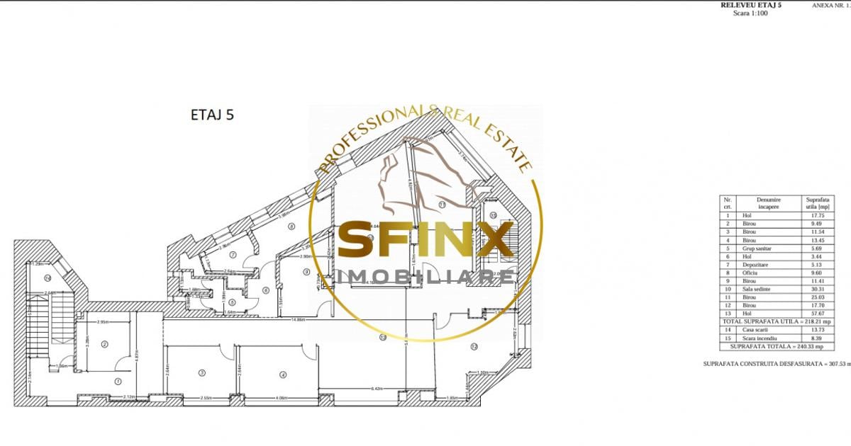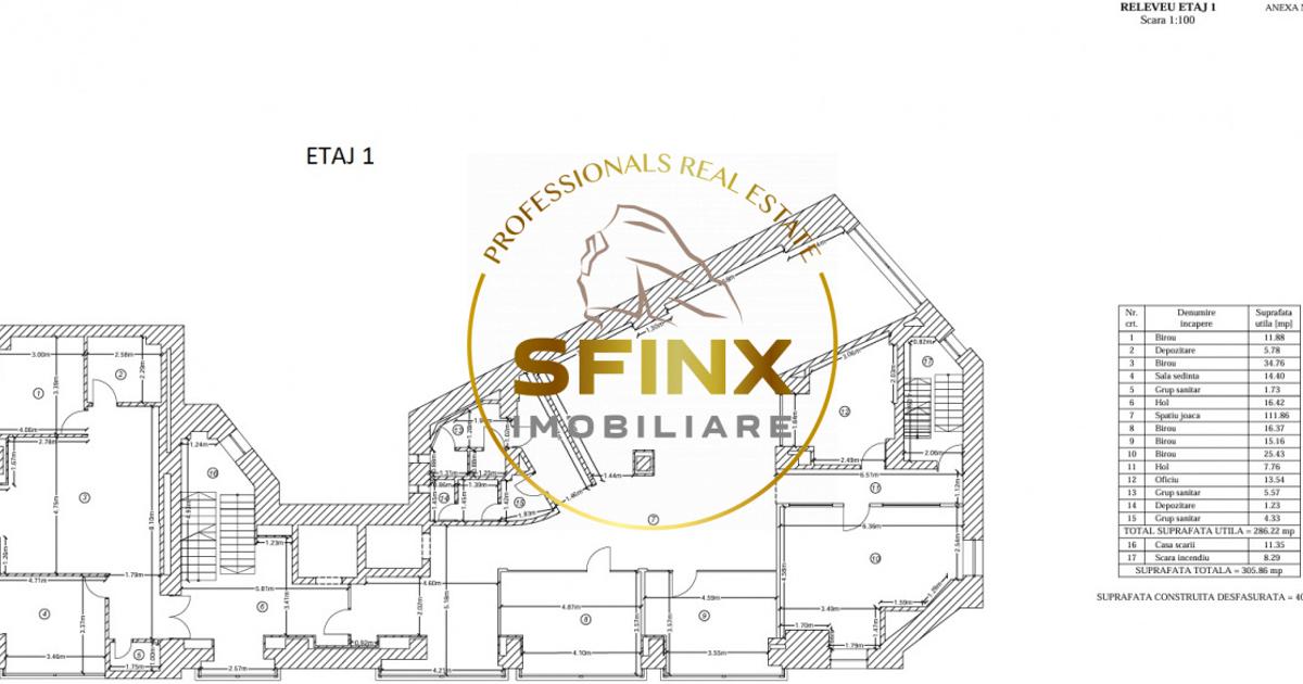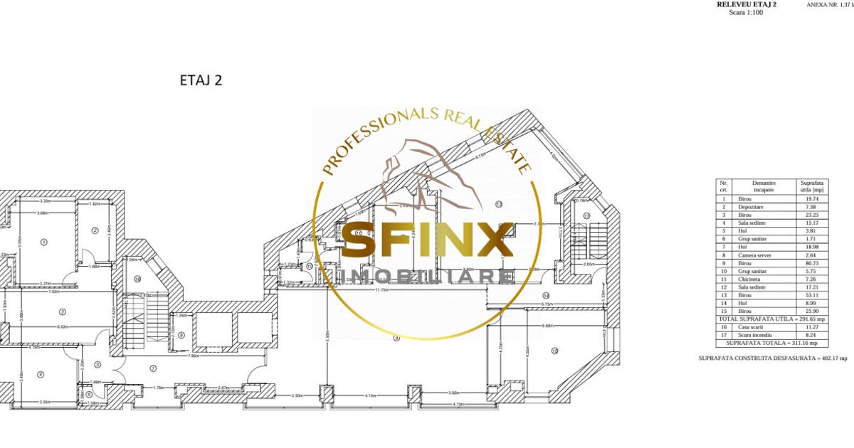 Inchiriata integral! Cladire de birouri SUBSOL-PARTER-5 ETAJE SI TERASA, situata in zona Unirii, la aproximativ 2 minute de mers pe jos de statia de metrou Dimitrie Cantemir. Imobilul are acces facil catre principalele artere ale orasului si beneficiaza de transport public in imediata apropiere. Constructia a fost realizata in anul 1998, are o suprafata totala de 2305.69 mp si este amplasata pe un teren cu suprafata de 530 mp, avand o amprenta la sol de 408 mp. Suprafetele pe nivel sunt urmatoarele: Subsol – 282.23 mp Parter – 290.68 mp Etaj 1 – 305.86 mp Etaj 2 – 311.86 mp Etaj 3 – 310.79 mp Etaj 4 – 300.14 mp Etaj 5 – 240.33 mp Terasa – 264.50 mp Cladirea permite compartimentari flexibile si poate fi utilizata pentru birouri, clinica medicala, centru de servicii, activitati educationale sau alte functiuni similare. Configuratia pe etaje permite atat inchirierea integrala, cat si inchirierea pe niveluri, in functie de necesitatile viitorului utilizator sau investi...