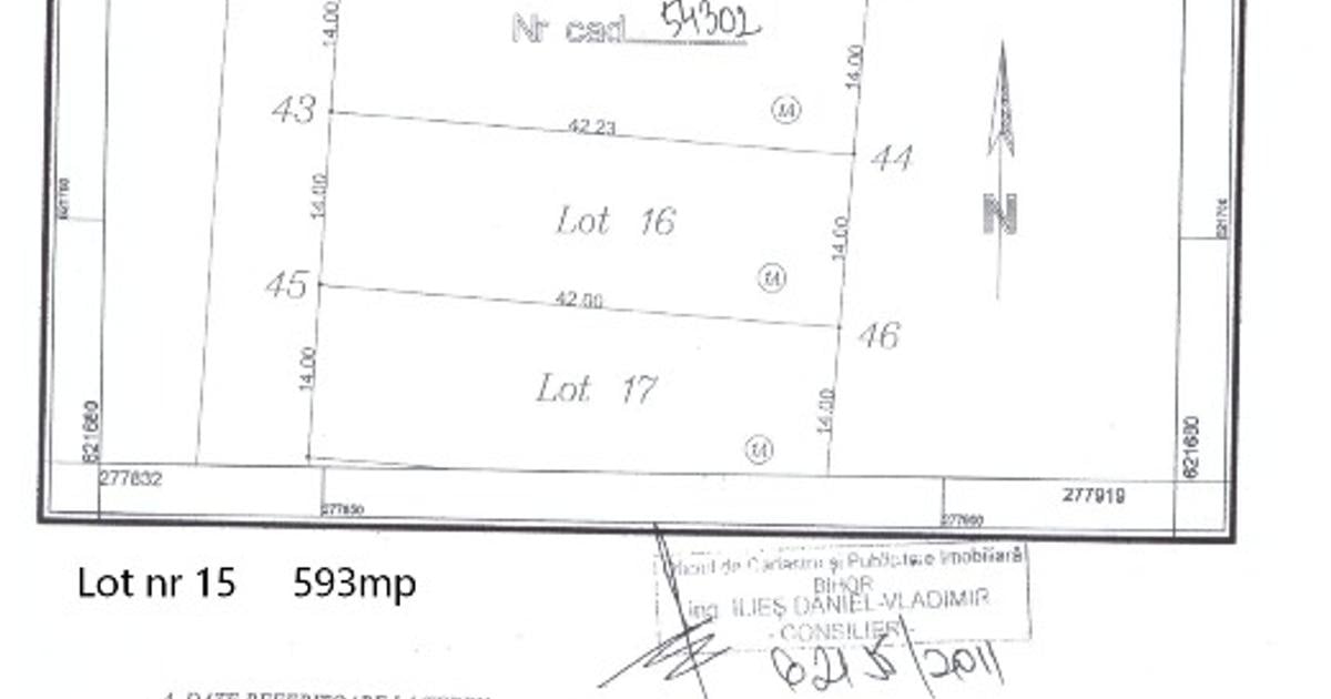 De vanzare 2 parcele de teren intravilan de 600 mp fiecare cu front la strada 14 mt fiecare, si lungime 42 mt fiecare. Pe teren exista proiect pentru constructia a doua case (duplex) de aproximativ 175 mp fiecare. Terenul este in apropierea drumului national Oradea - Cluj Napoca intr-o zona linistita si la o distanta de aproximativ 5 km de Oradea.
