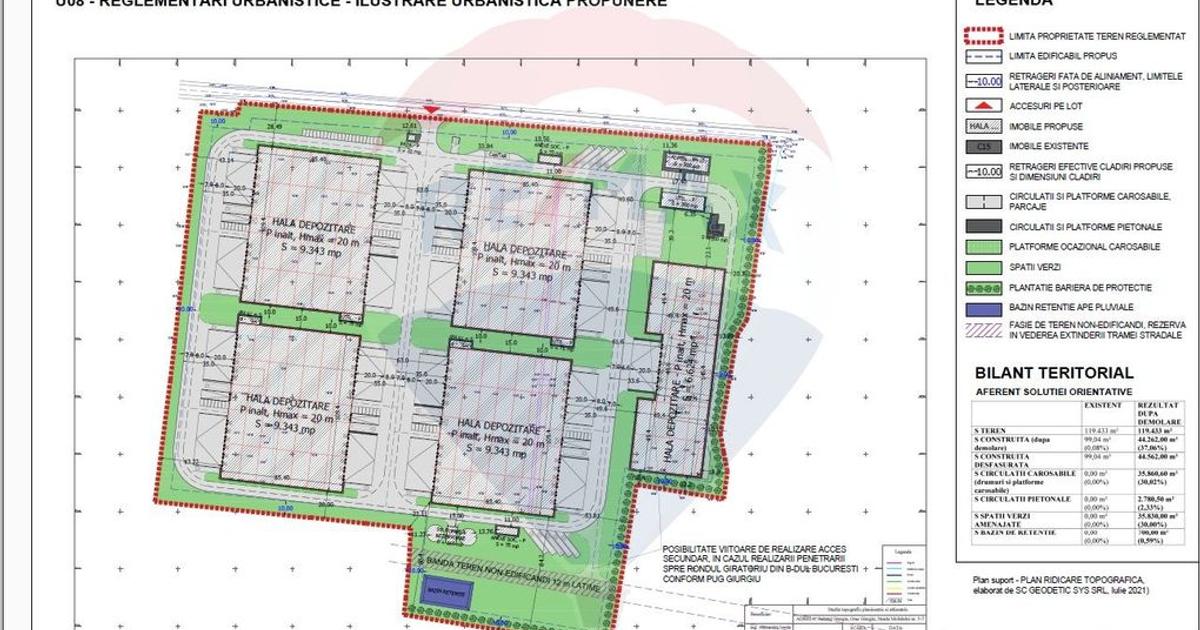 Teren de vânzare cu PUZ aprobat – 119.433 mp | Giurgiu Nord – Destinație logistică, industrială și servicii Reglementare urbanistică (PUZ aprobat): Parc de activități cu funcțiuni logistice și de producție Zonificare funcțională conform PUZ:, terenul este împărțit în două unități teritoriale (UTR) distincte: 1. I1 – Subzonă de producție și depozitare Suprafață alocată: 45.202 mp POT max.: 50% CUT max. (volumetric): 10 mc/mp Regim maxim înălțime (RH): 20 m Funcțiuni: hale de producție, platforme de manevră, clădiri administrative și sociale 2. I1a – Subzonă de comerț, servicii și logistică Suprafață alocată: 74.231 mp POT max.: 50% CUT max. (volumetric): 10 mc/mp Regim maxim înălțime (RH): 20 m Funcțiuni: hale logistice, spații de comerț și servicii, platforme, parcări, spații verzi Construcții propuse conform PUZ – exemplu de implementare: Zona I1: HALA DEPOZITARE 6624 MP, Hmax = 20m Căi de acces auto & platforme de manevră: lățime 7 m + spații de întoarcere...