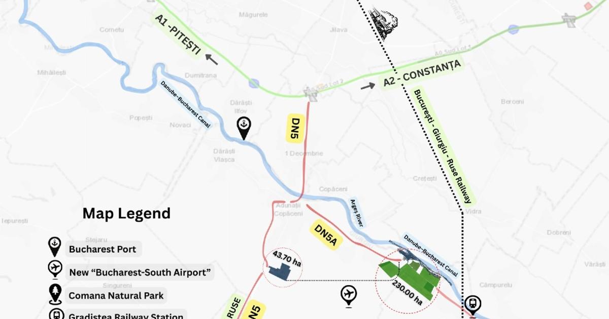 · Linia de cale ferată București–Giurgiu–Ruse la mai puțin de 10 km de teren
